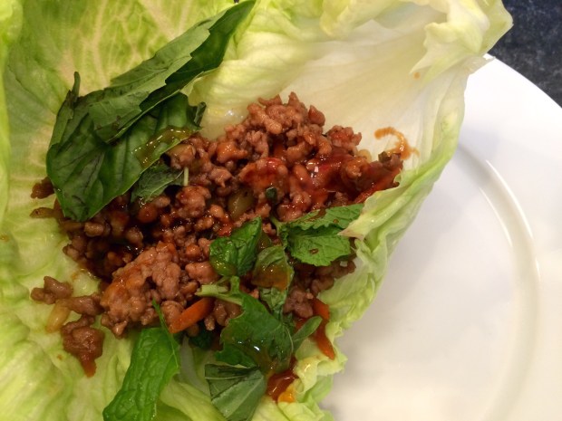 4. Separate the leaves of the lettuce, if you’re an overachiever, trim into cups. Place a little of the pork filling among the lettuce cups and add fresh herbs and sauce as desired.